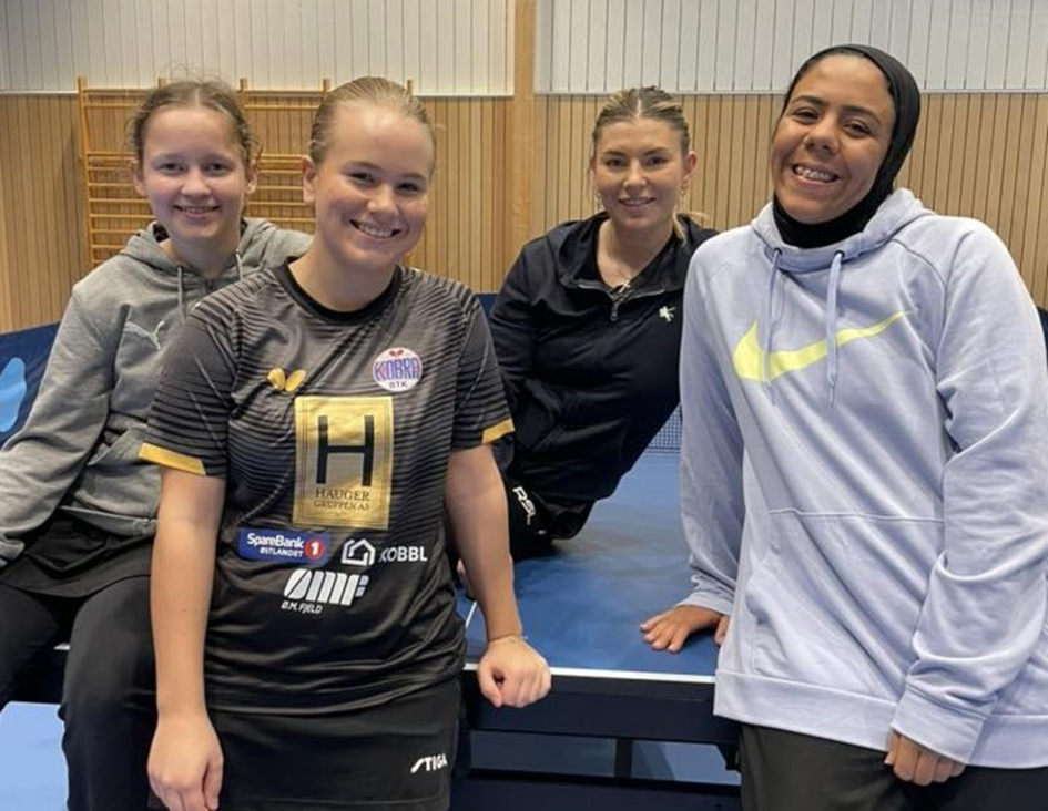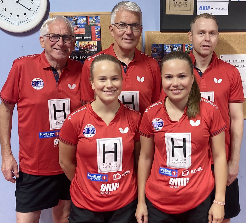 Fra venstre Kobras hovedtrener Kristoffer Nilsen, coach for damelaget Martine Pettersen Kvinge, Maja Pettersen Kvinge, Mariam Hussein, Kristina Pirtskhalava og Kobras leder Anne Haug. Liggende